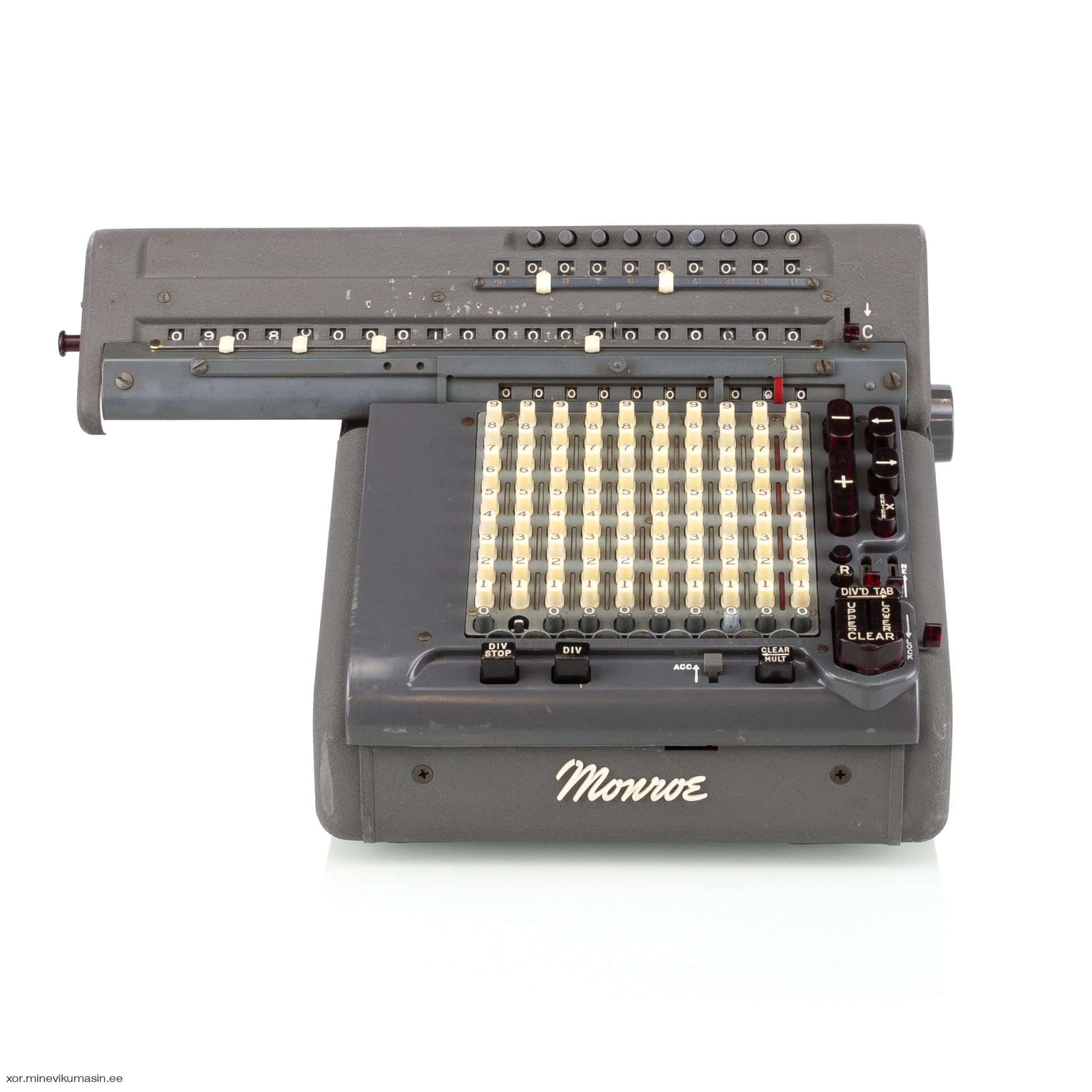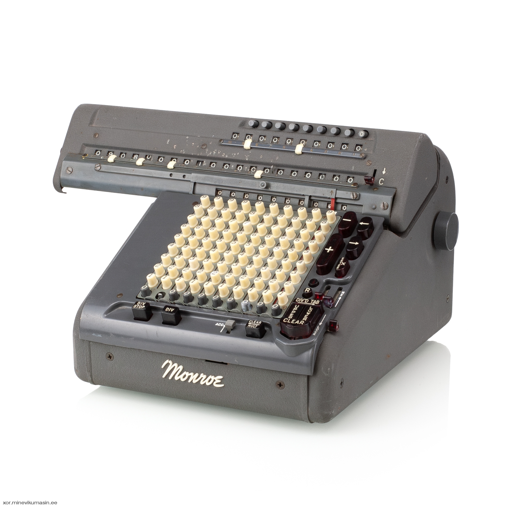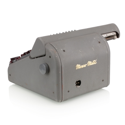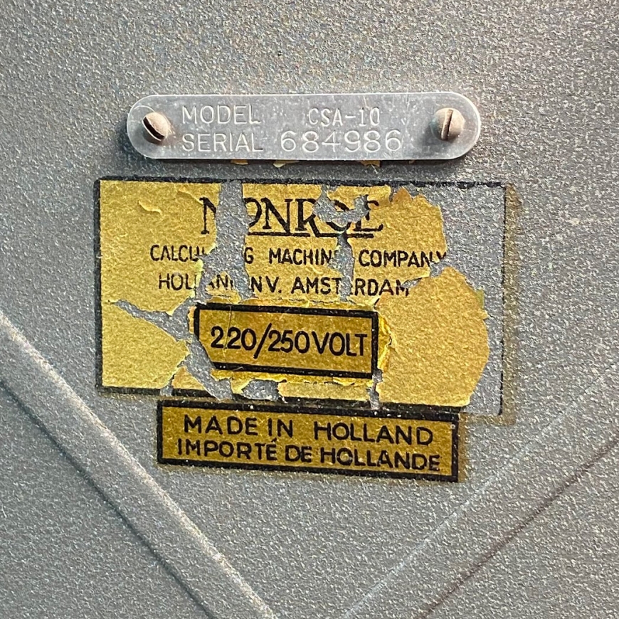 The Monroe Calculating Machine Company was founded in New York in 1912 by businessman Jay Randolph Monroe. Just two years later, in 1914, the first commercially successful mechanical calculator entered full-scale production in Orange, New Jersey. Monroe’s machines ranged from simple hand-cranked models to motor-driven devices with multiple registers and fully automatic multiplication and division. After World War II, under the Marshall Plan, Monroe expanded into Europe, establishing factories in the Netherlands and Italy. The Monroe CSA-10 Monro-Matic, produced between 1950 and 1966 in the Netherlands, is an electro-mechanical, fully automatic, stepped-drum calculator with a full keyboard. It features automatic multiplication and division, electric carriage transport, and automatic clearing of counters. Registers: 10 x 10 x 20 Dimensions: 35 x 28 x 23/29 cm Weight: 11,4 kg | ||||
