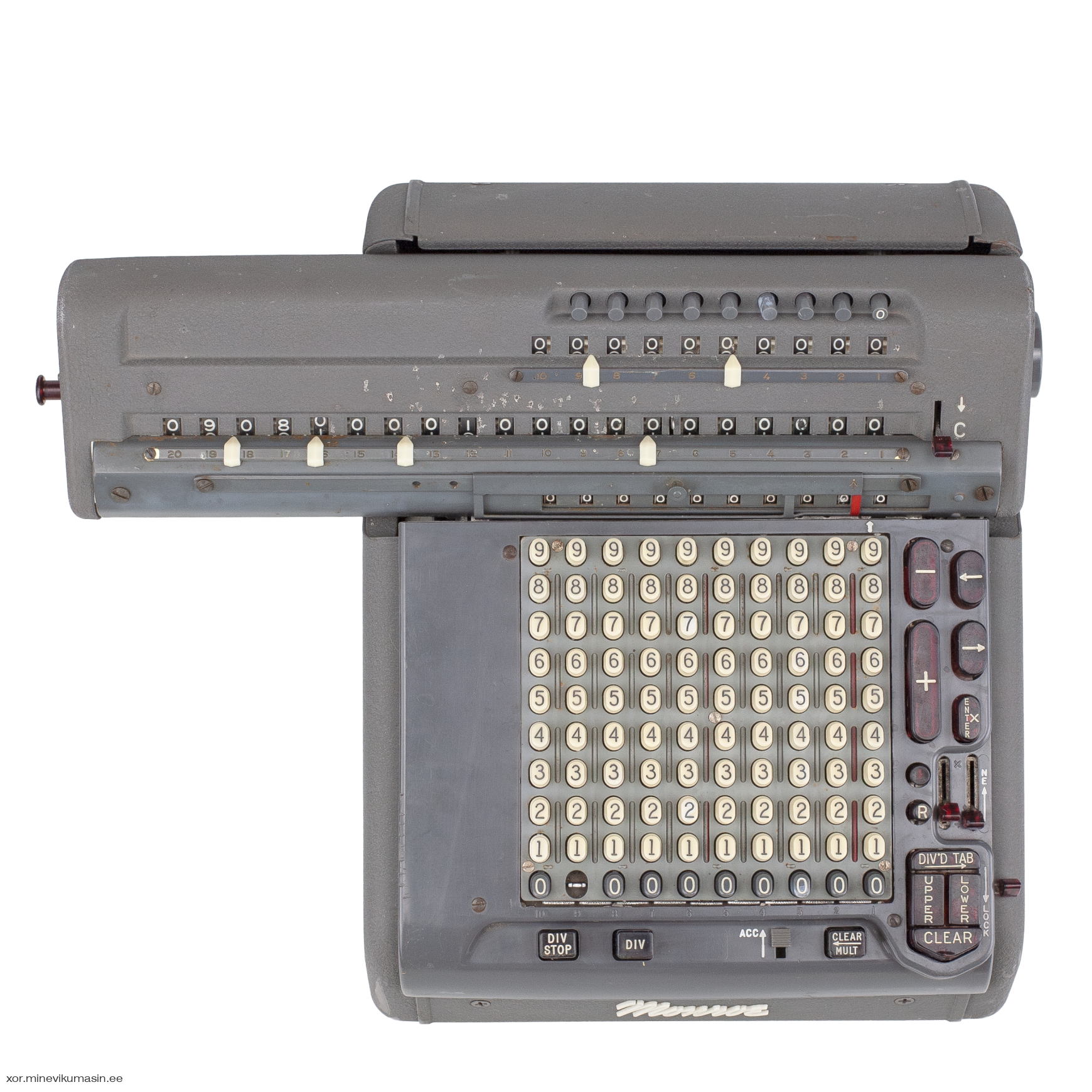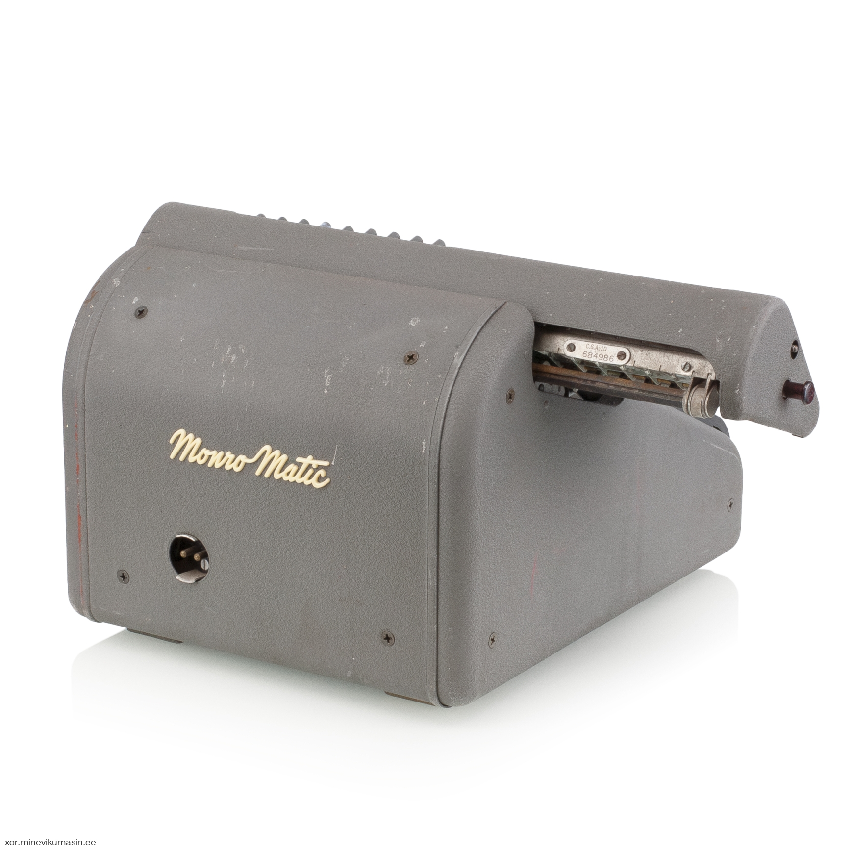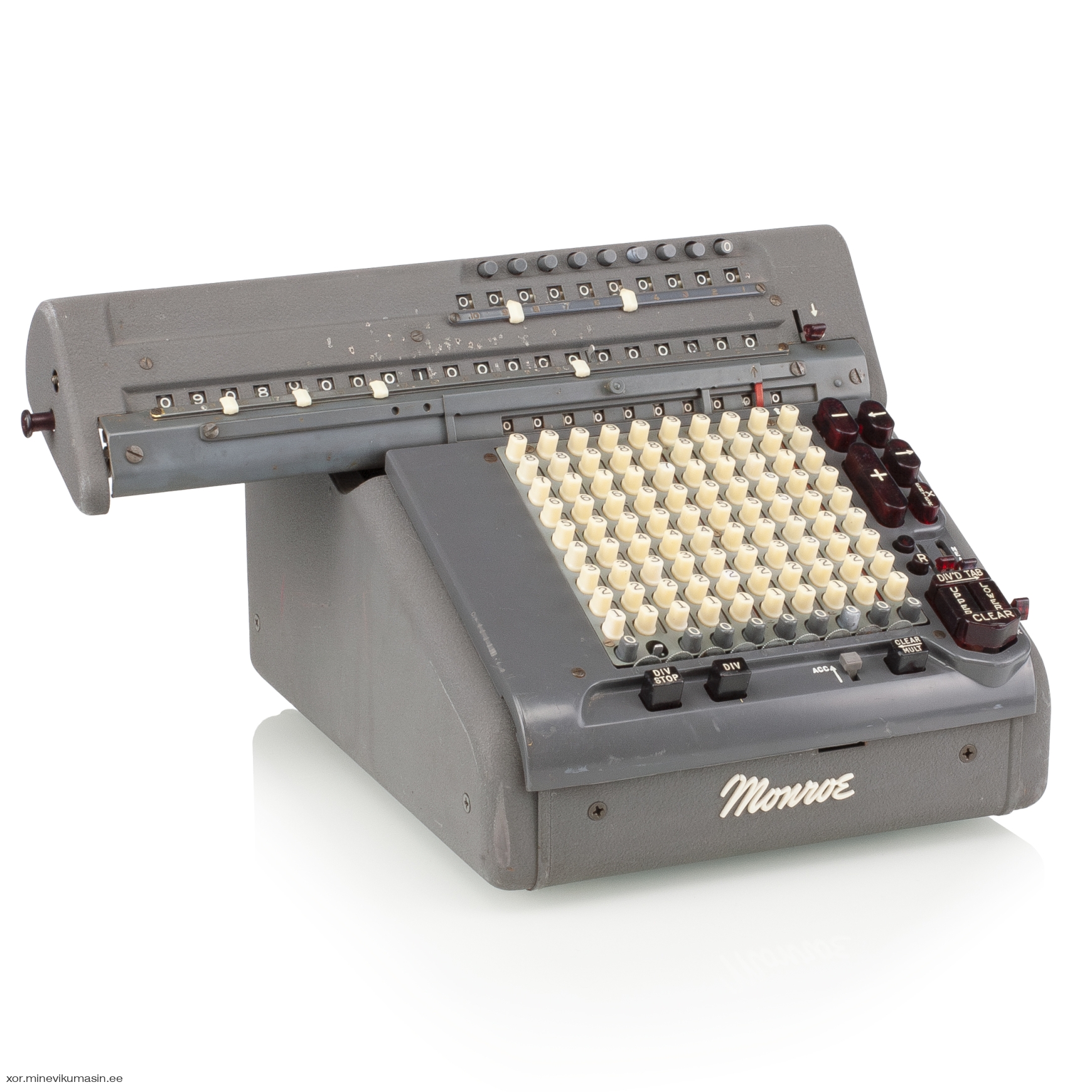 The Monroe Calculating Machine Company was founded in New York in 1912 by businessman Jay Randolph Monroe. Just two years later, in 1914, the first commercially successful mechanical calculator entered full-scale production in Orange, New Jersey. Monroe’s machines ranged from simple hand-cranked models to motor-driven devices with multiple registers and fully automatic multiplication and division. After World War II, under the Marshall Plan, Monroe expanded into Europe, establishing factories in the Netherlands and Italy. The Monroe CSA-10 Monro-Matic, produced between 1950 and 1966 in the Netherlands, is an electro-mechanical, fully automatic, stepped-drum calculator with a full keyboard. It features automatic multiplication and division, electric carriage transport, and automatic clearing of counters. Registers: 10 x 10 x 20 Dimensions: 35 x 28 x 23/29 cm Weight: 11,4 kg | ||||