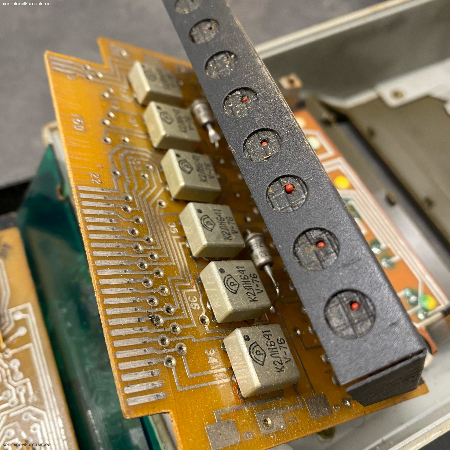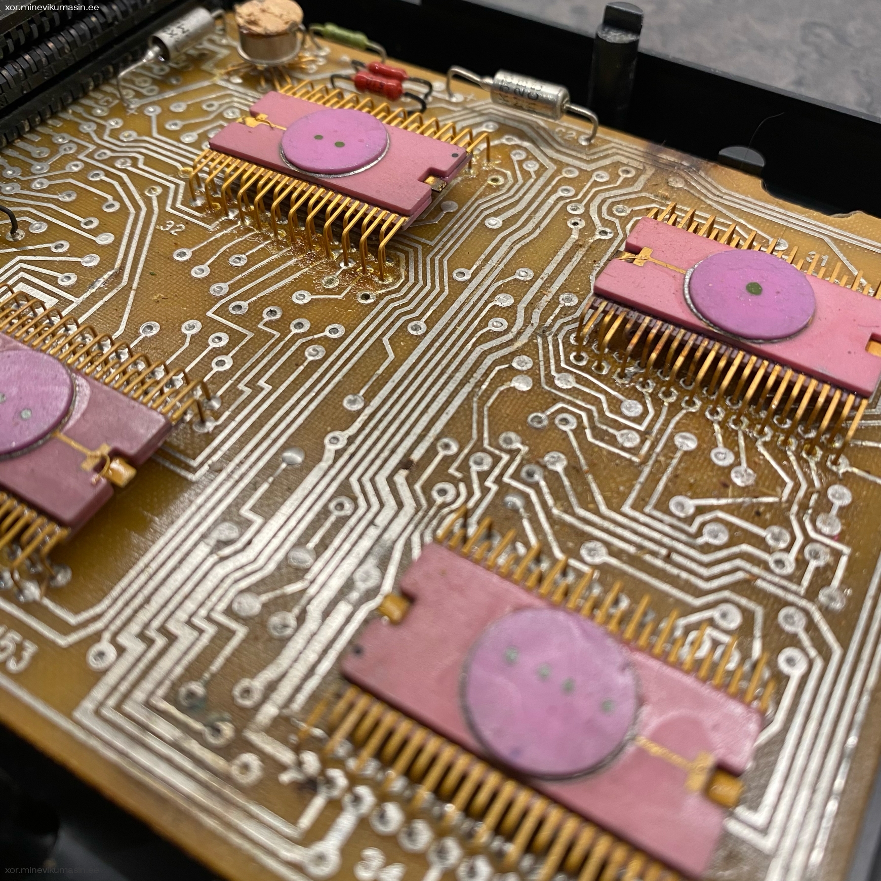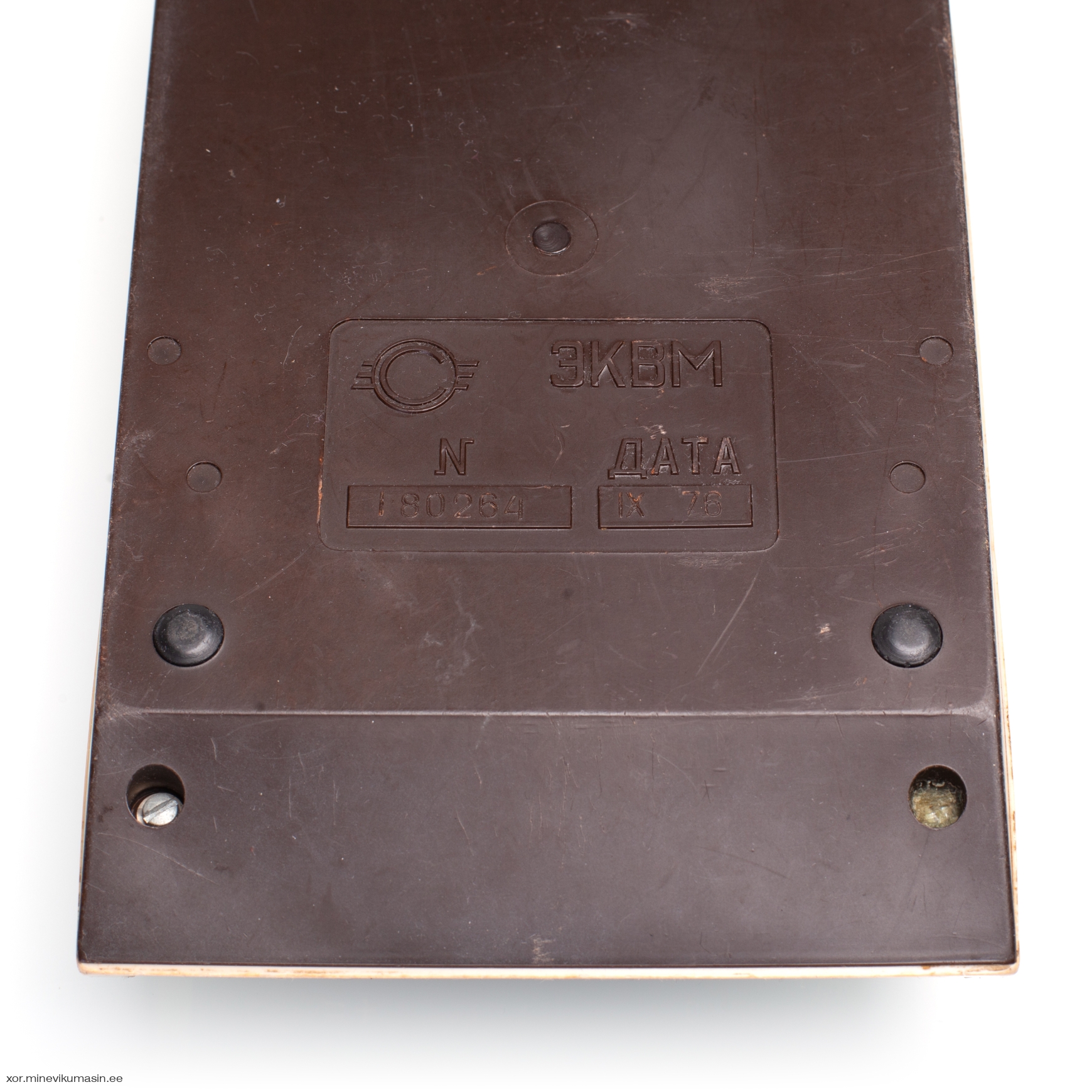 The Elektronika S3-07 features a 8-digit 7-segment Vacuum Fluorescent Display (VFD). Its logic is based on four p-MOS large-scale integrated circuits (LSI) - early versions of К145/К1ЖГ45-series chips without any markings except green dots (1-4 dots). Four individual chips are for memory and synchronization, arithmetics, input and control. For the display-tubes the calculator uses К2ЛН641 small-scale integrated circuits (SSI). All chips and various other components are dated to 1976.