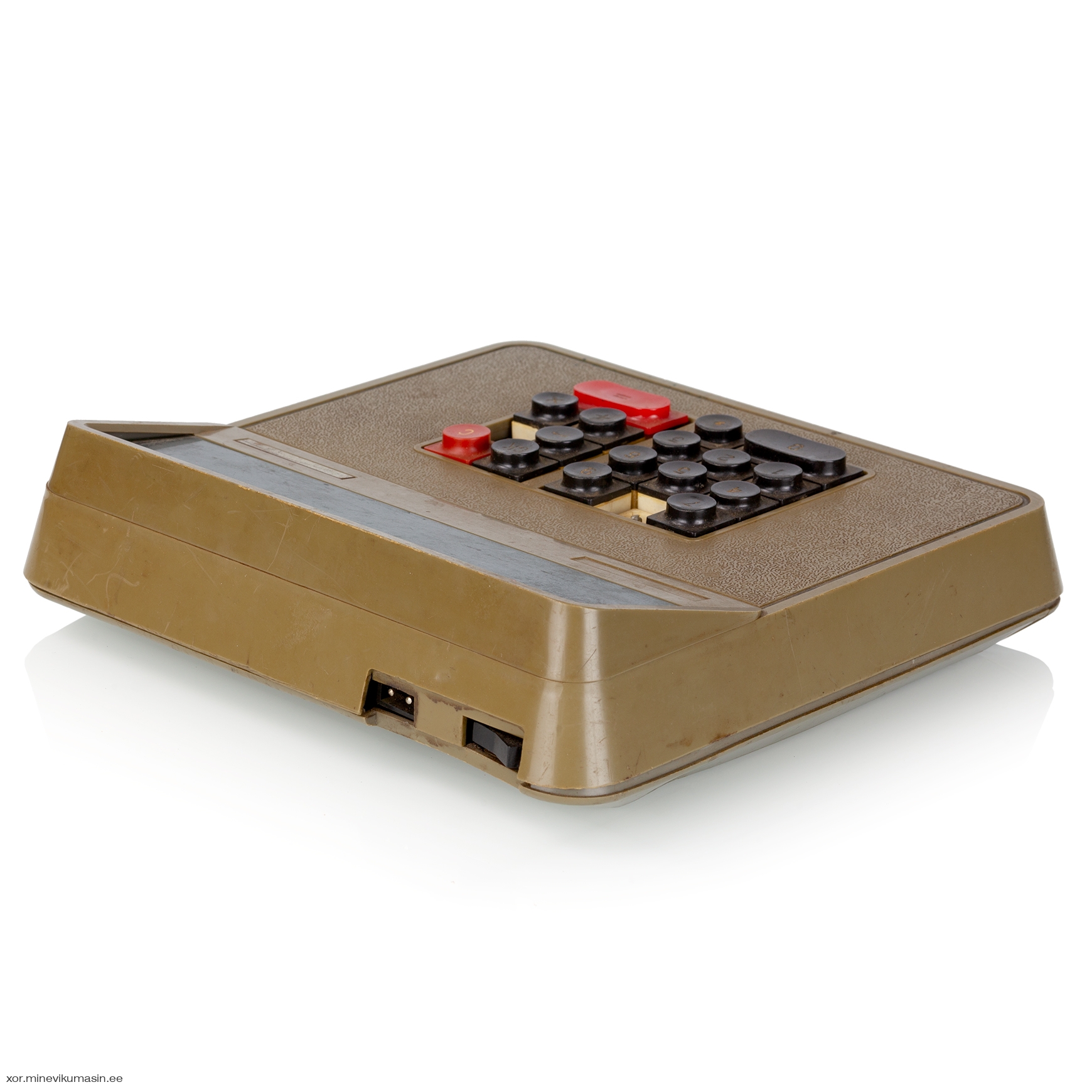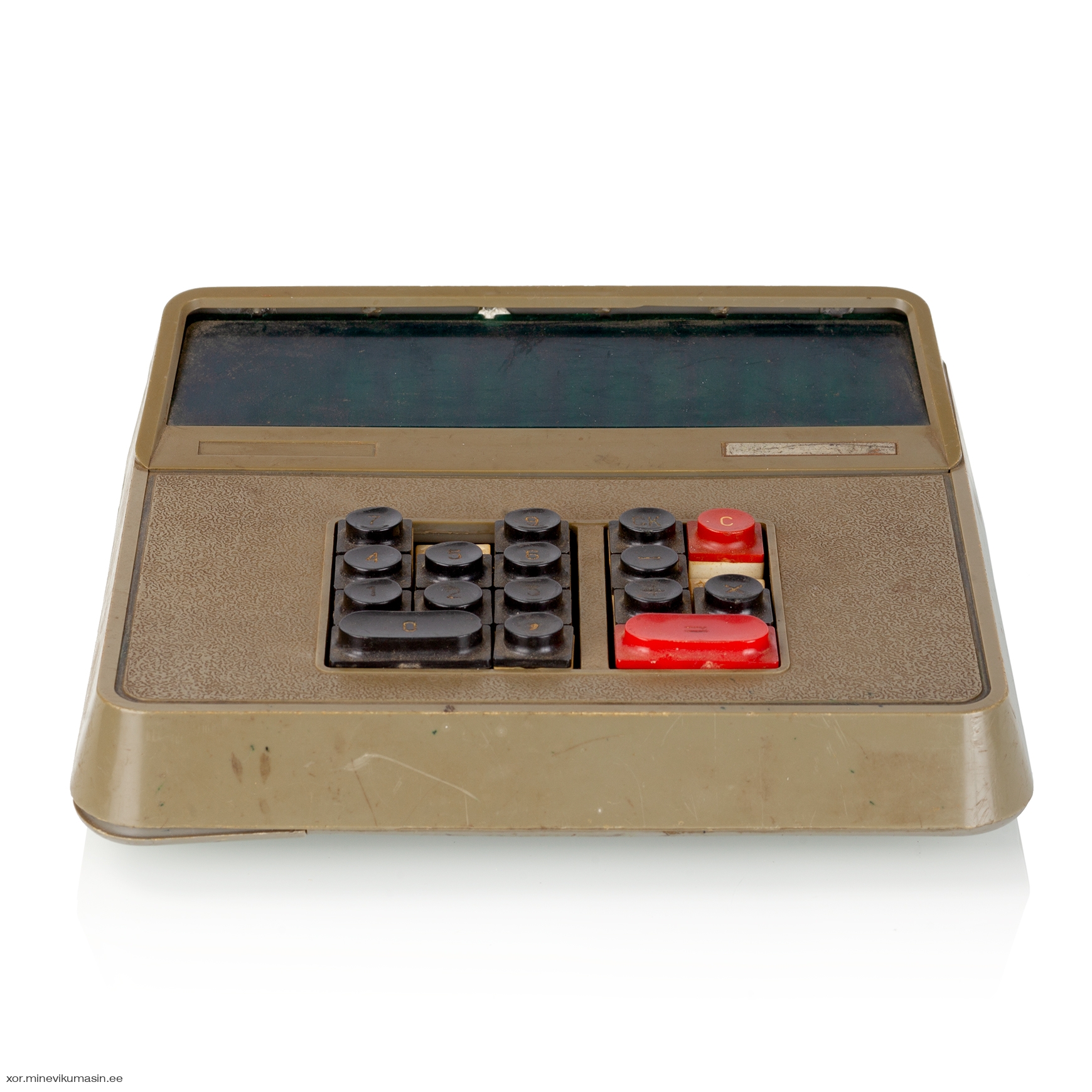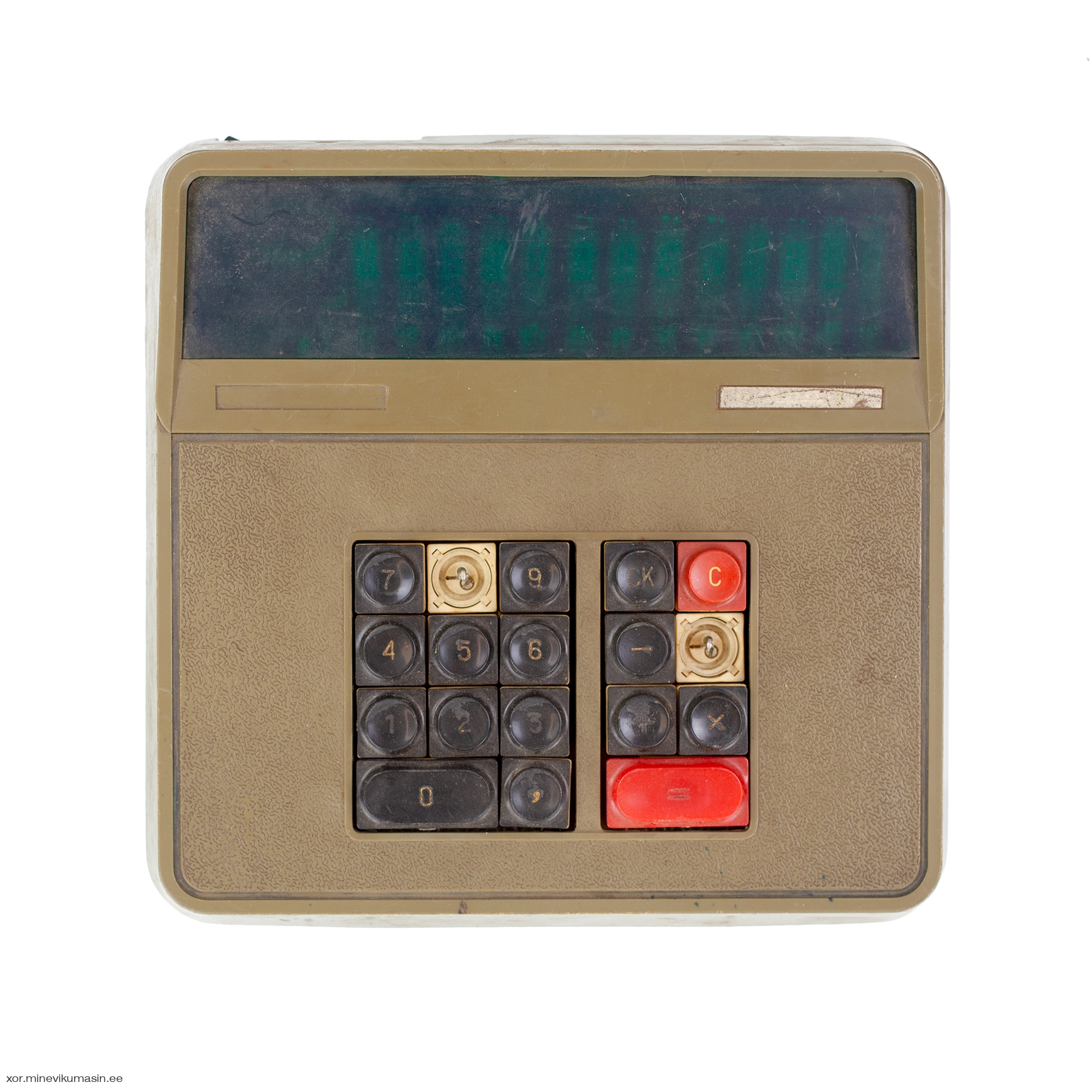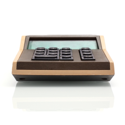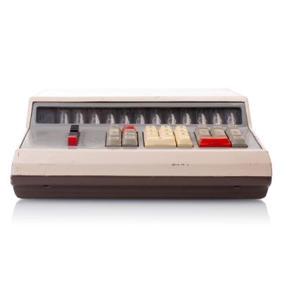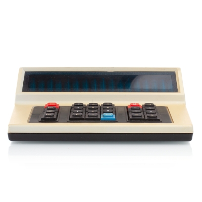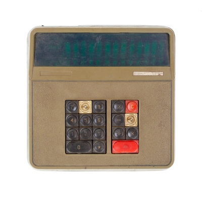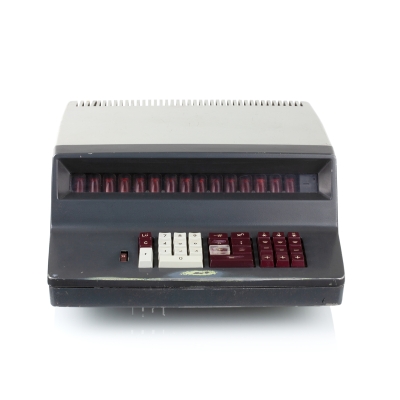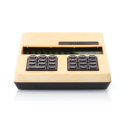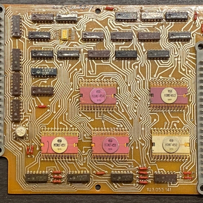The Iskra-210 features a 12-digit 7-segment Vacuum Fluorescent Display (VFD). Its logic is based on four p-MOS large-scale integrated circuits (LSI) - К1ЖГ451 (memory and synchronization, 2 pcs), К1ЖГ452 (arithmetics), К1ЖГ453 (input), К1ЖГ454 (control). For the synchronisation there's a 4-phase pulse generator К1ГФ651. In addition the main circuit board has various small-scale integrated circuits (SSI), such as the К1..721 and К161 series. The chips from various USSR manufacturers are dated between 1976 and 1977.