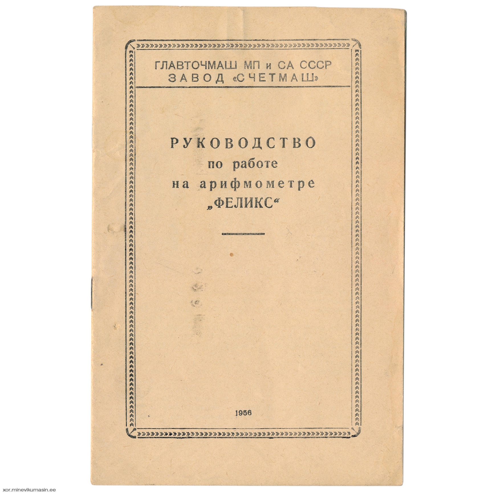 Passport and instruction manual for the mechanical calculator Feliks with serial number M56131 manufactured in 21.06.1956 by the factory Schetmash. Sold to the end user in 17.06.1956 in Tallinn, Estonian SSR by official retailer "Союзмашприборсбыт". The price of the calculator in 1956 was 137 roubles. | |