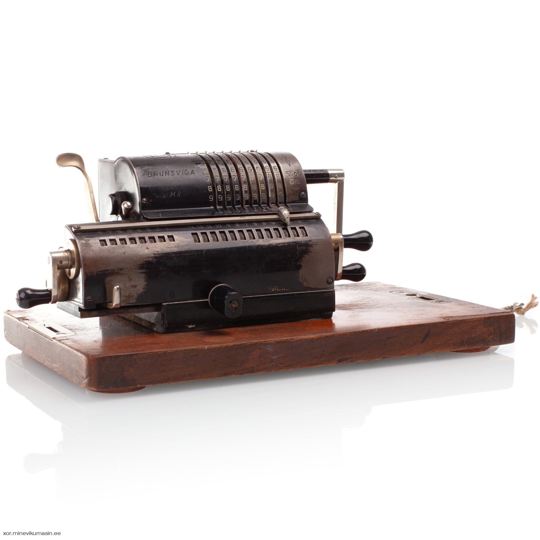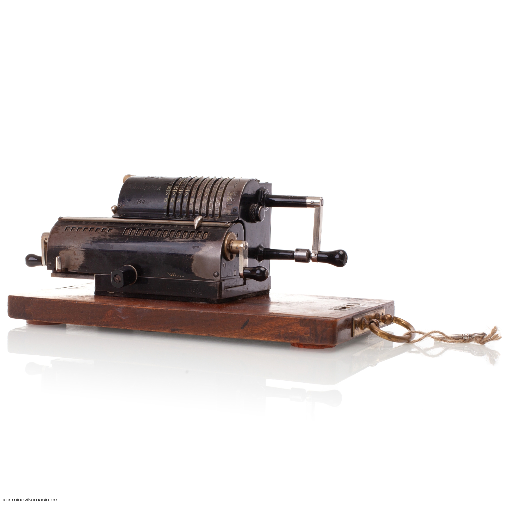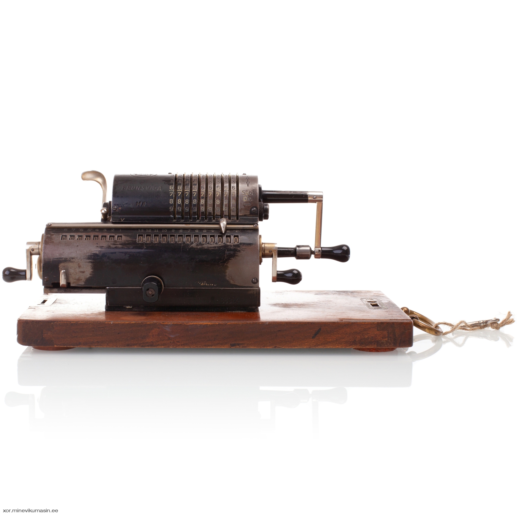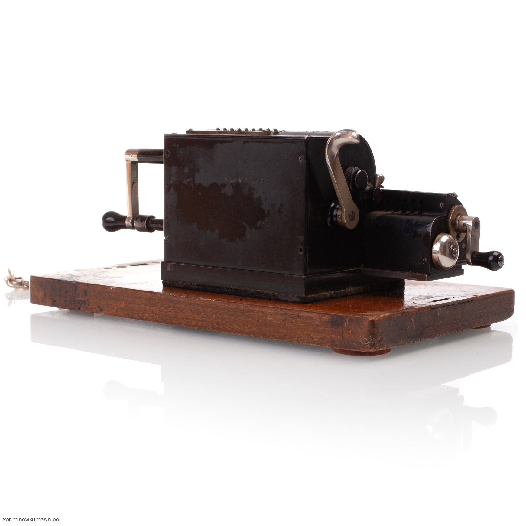 The Brunsviga M II is a pinwheel Odhner-type mechanical calculating machine, manufactured in 1926 by Grimme, Natalis & Co. AG in Braunschweig, Germany. In 1892, one of Germany's top sewing-machine manufacturers, Grimme and Natalis, bought Odhner's patent for the pinwheel-type calculating machine. The patent included distribution rights in Germany, Belgium, and Switzerland. The calculating machines were launched under the brand name Brunsviga — the Latin name for Brunswick — in reference to the city of Braunschweig. As early as 1908, Brunsviga introduced its first Model M calculating machine to the market. In 1922, the local competitor Rema, which had been producing calculators since 1919, was acquired. Thereafter, two new calculator models — previously Rema II and Rema III — went to production and were rebranded as Brunsviga M II and M III. In 1927, the company's name was changed to Brunsviga Maschinenwerke Grimme, Natalis & Co. AG, and later to Brunsviga Maschinenwerke AG. This machine has a history in Finland and found its place here in this collection in 2018. Registers: 9 x 8 x 13 Weight: 5,1kg Dimensions: 15 x 28 x 14 cm | ||||