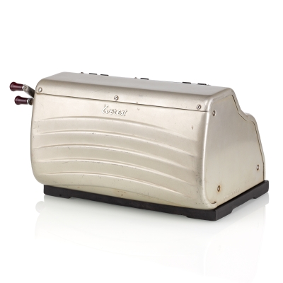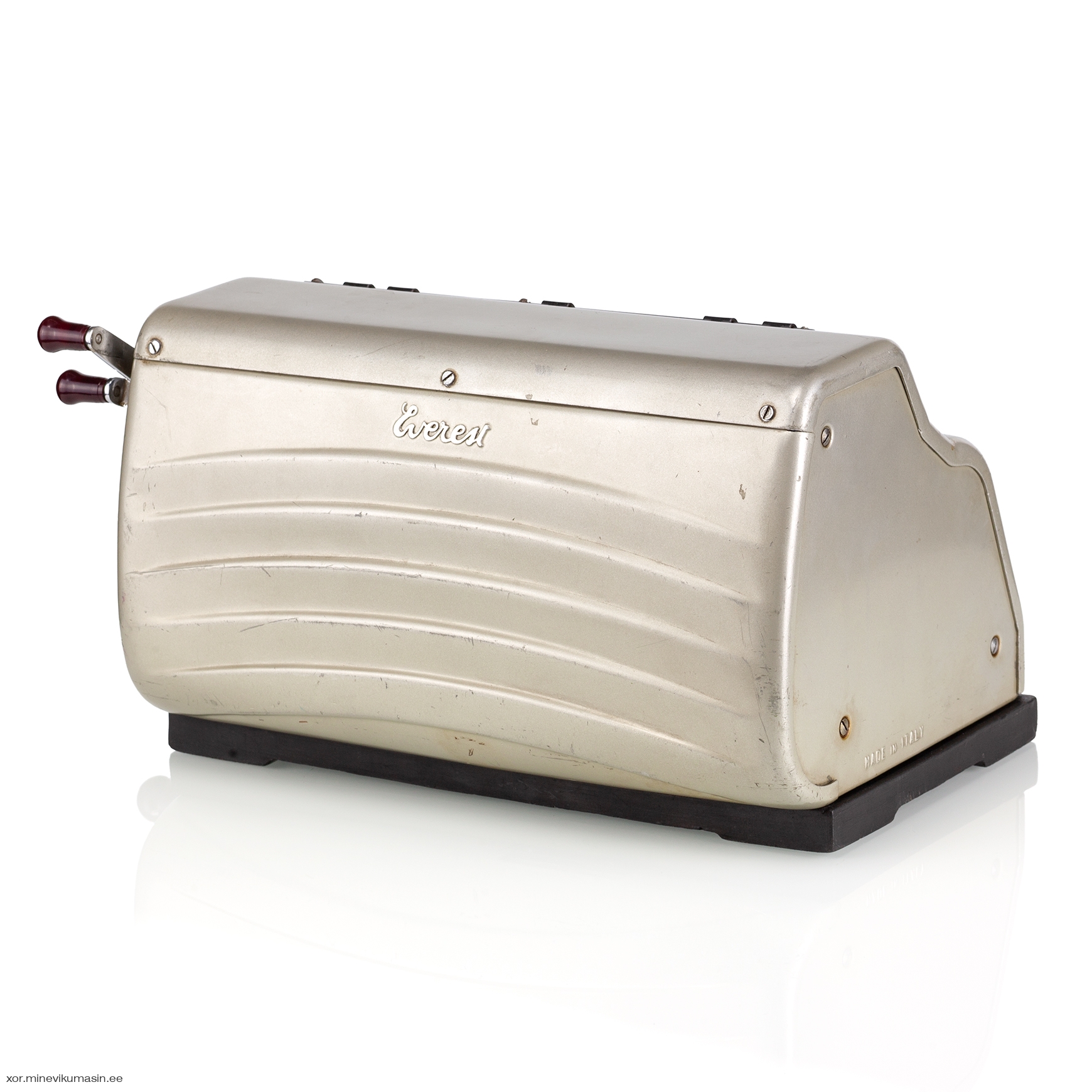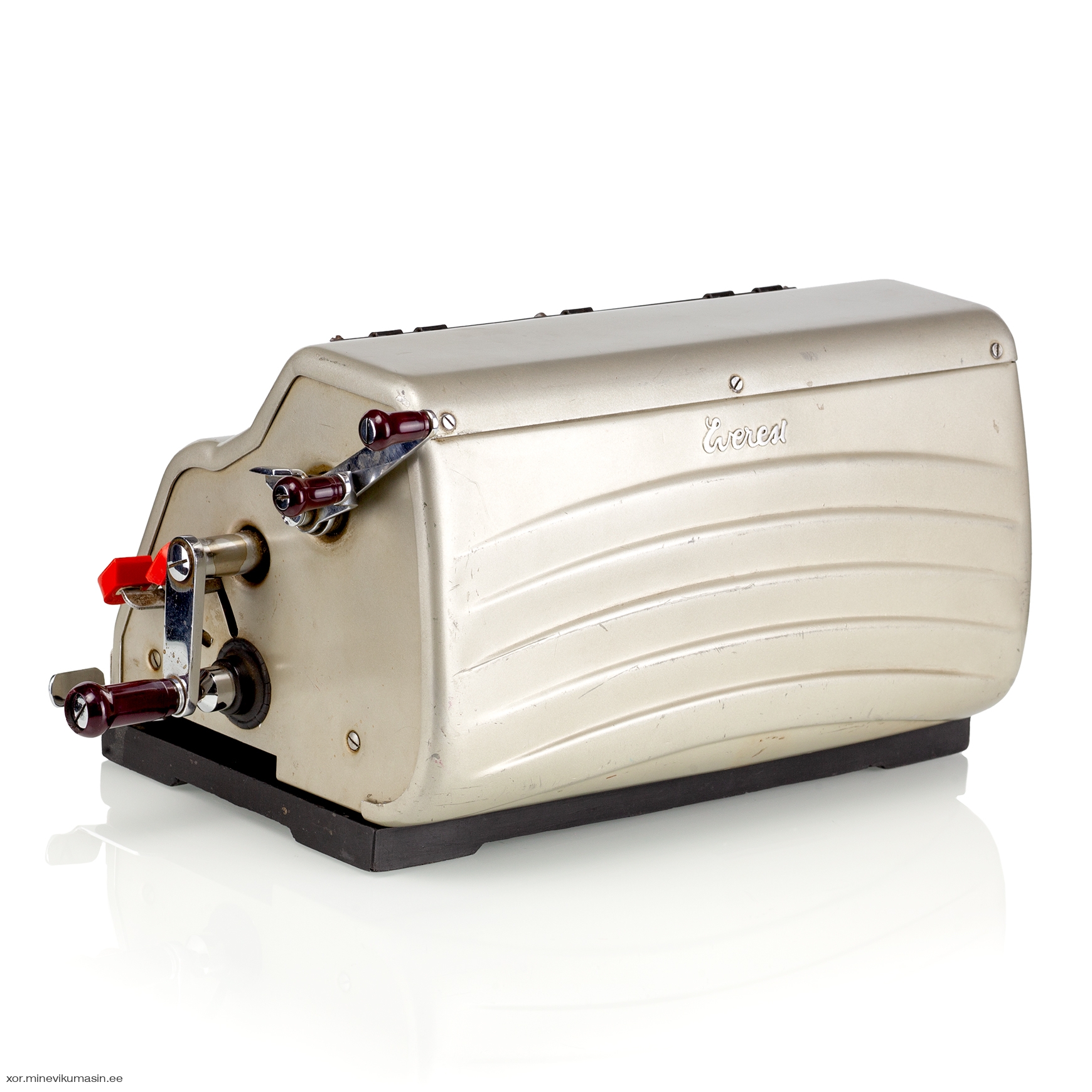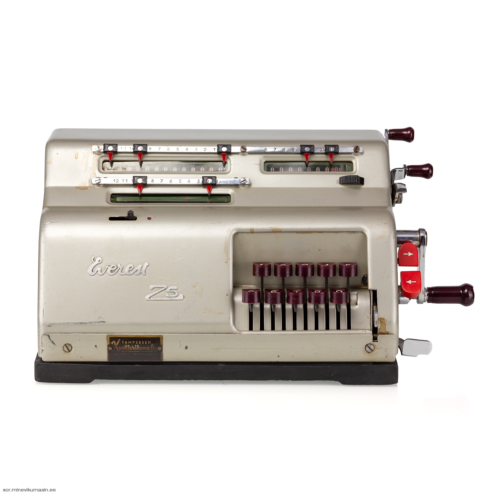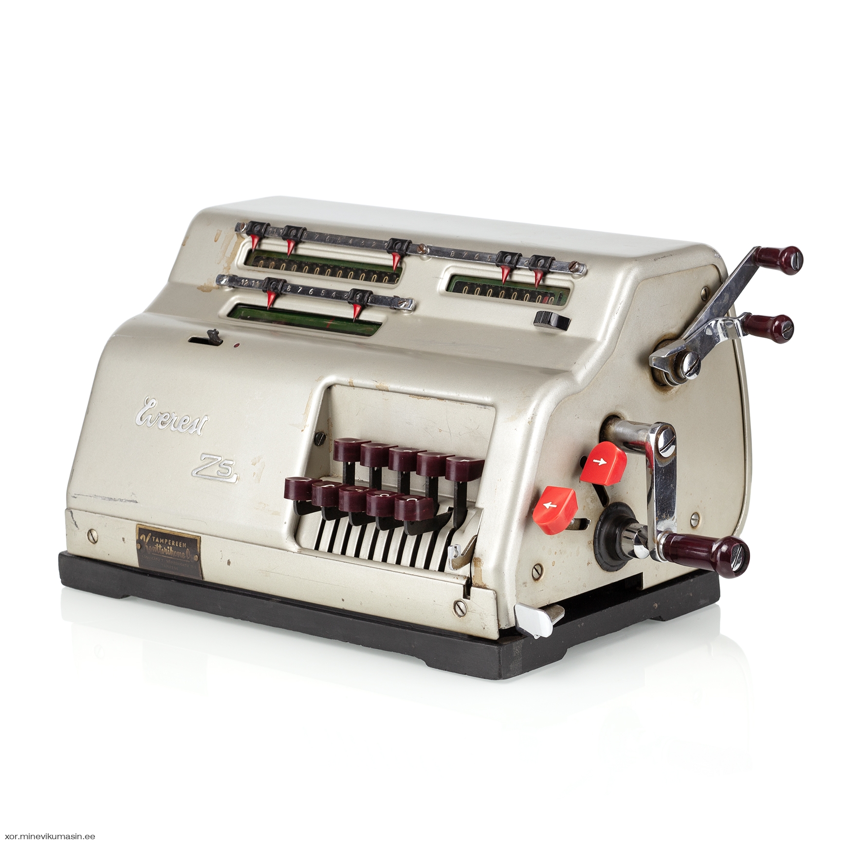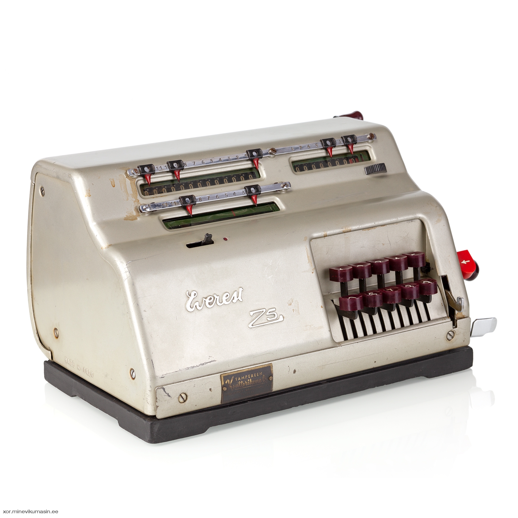 Italian company Serio S.A. was founded in 1932 and began manufacturing typewriters under the brand name Everest. The factory was located in the city of Crema, Northern Italy. In 1935, Serio S.A. acquired Sozzi-Inzadi S.A., a Milan-based company that produced adding-listing machines. Serio continued to manufacture these machines under the brand name Alfa-Everest until World War II. In 1947, the new Z-series was launched, and Everest became the sole brand name of Serio S.A. The Z5 model was produced between 1953 and 1960. It was a 10-key keyboard, crank-operated calculator capable of performing the four basic mathematical operations. It had a separate division key next to the numeric keyboard, which shifted the carriage all the way to the left for entering the dividend. The Everest Z5 featured a 13-digit main register on the top left, an 8-digit counter on the top right, and a moving 9-digit input register at the front. The present machine bears a Finnish reseller tag on the front case: Tampereen Konttorikone Oy – located in Tampere, Finland. This office supplies company was established in 1944 and still operates in the same location in Tampere. In 1967, Olivetti acquired control of Serio S.A. Two years later, in 1969, Serio was merged into Olivetti, and the Everest brand ceased to exist. References: Jaap's Mechanical Calculators Page, Rechnerlexikon Registers: 9 x 8 x 13 Dimensions: 290 (L) x 200 (W) x 160 (H) mm Weight 7 kg | ||||