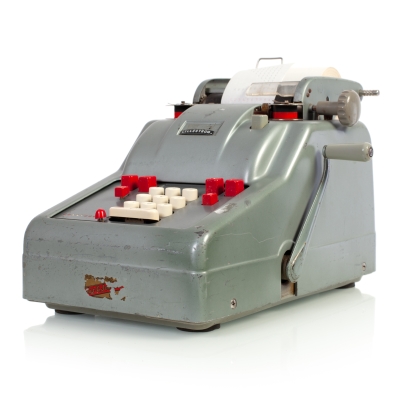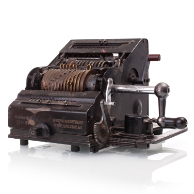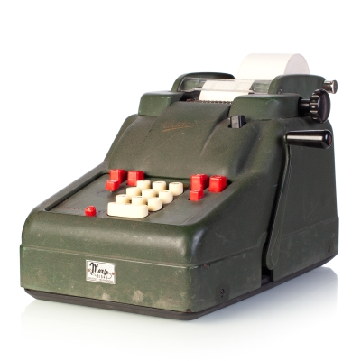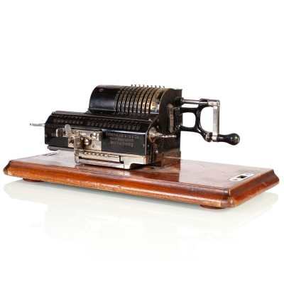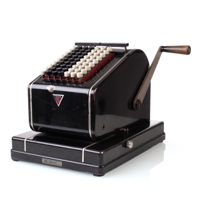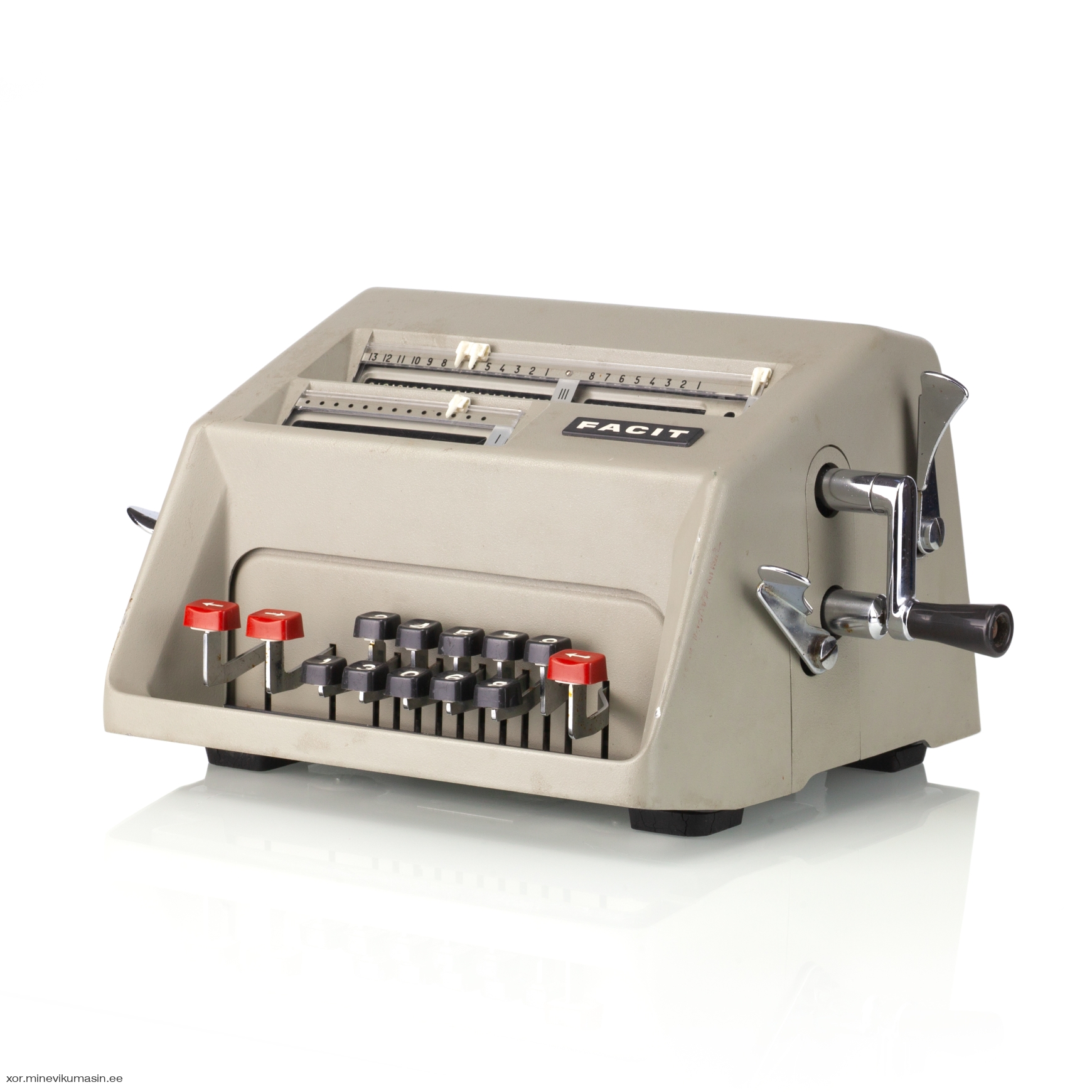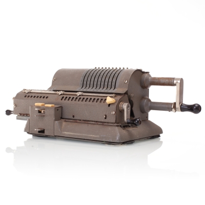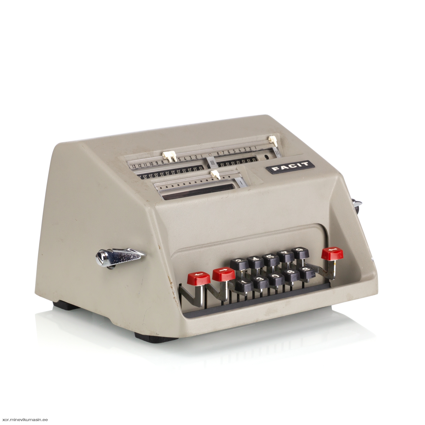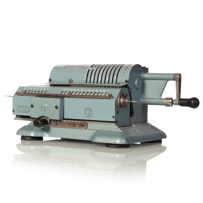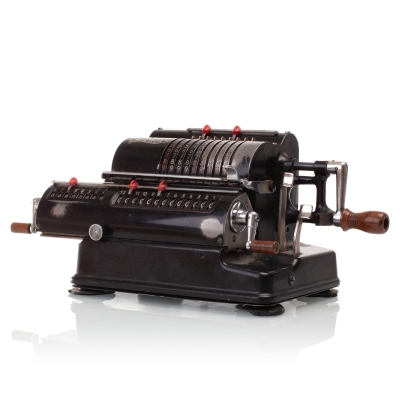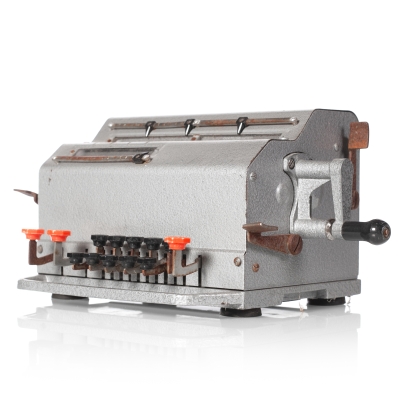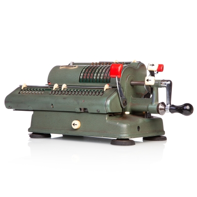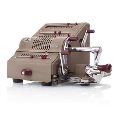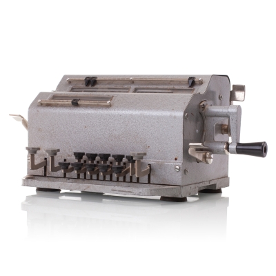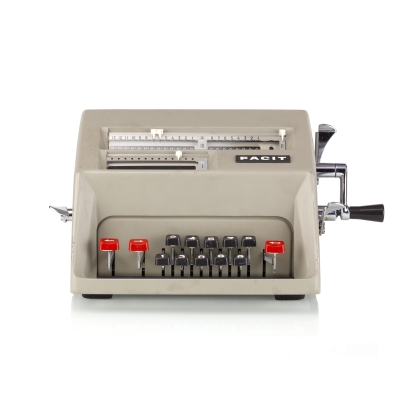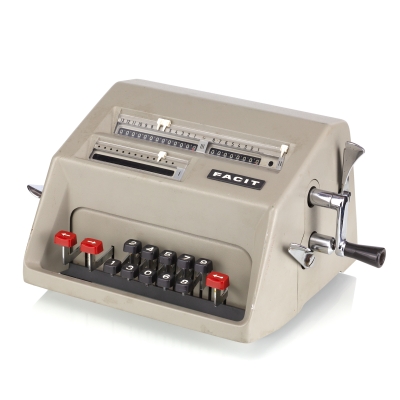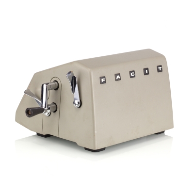 The Facit C1-13 is a mechanical calculator with a pinwheel mechanism. It was manufactured between 1957-1969 by Facit AB in Sweden and other Facit's factories across the globe. A characteristic feature of Facit machines was the input keyboard digits placement a.k.a. the Dalton keyboard. The C1-13 exterior was designed by Sigvard Bernadotte. The mechanism is based on an inverted Odhner's pinwheel-type calculator (moving setting register instead of the moving result/revolution carriage). The mechanism itself changed very little during the first Model T manufactured from 1932 onwards, followed by TK (from 1936), NTK (from 1954), and finally C1-13 (from 1956). Model C1-13 was manufactured in large numbers until 1969. This machine comes from Turku, Finland. It has a service label on the bottom from the service company Tuloskone Oy. It was last serviced on 7th of April 1971. References: ARITHMEUM Registers: 9 x 8 x 13 Weight: 6,4 kg Dimensions: 15 x 31 x 21 cm | ||||