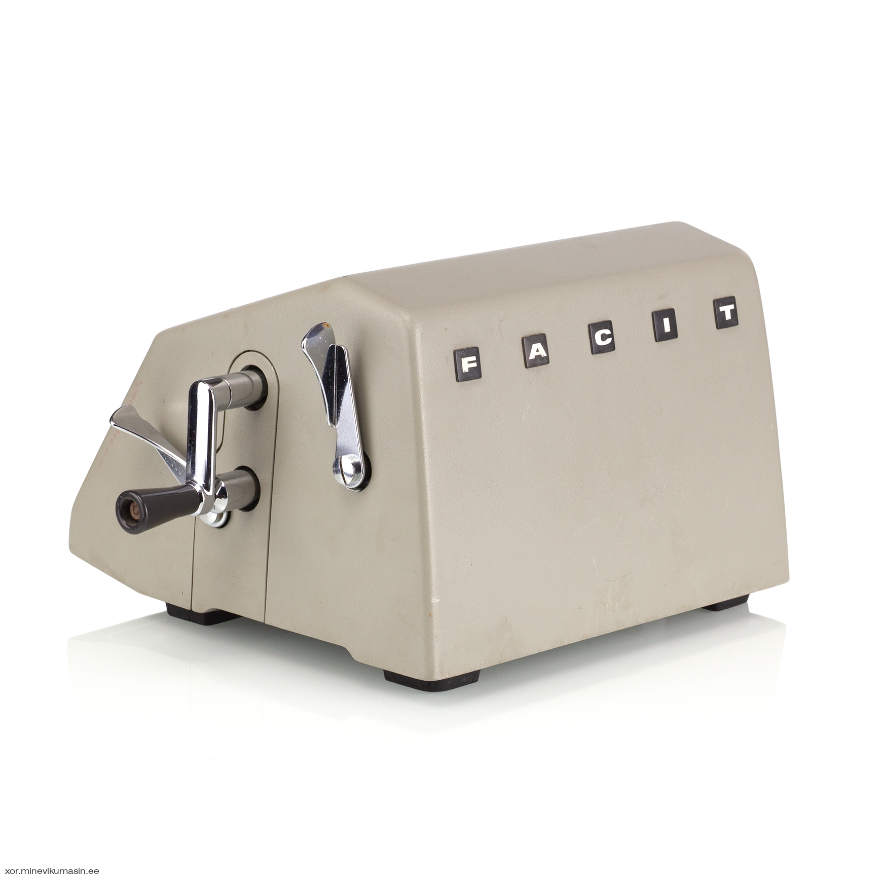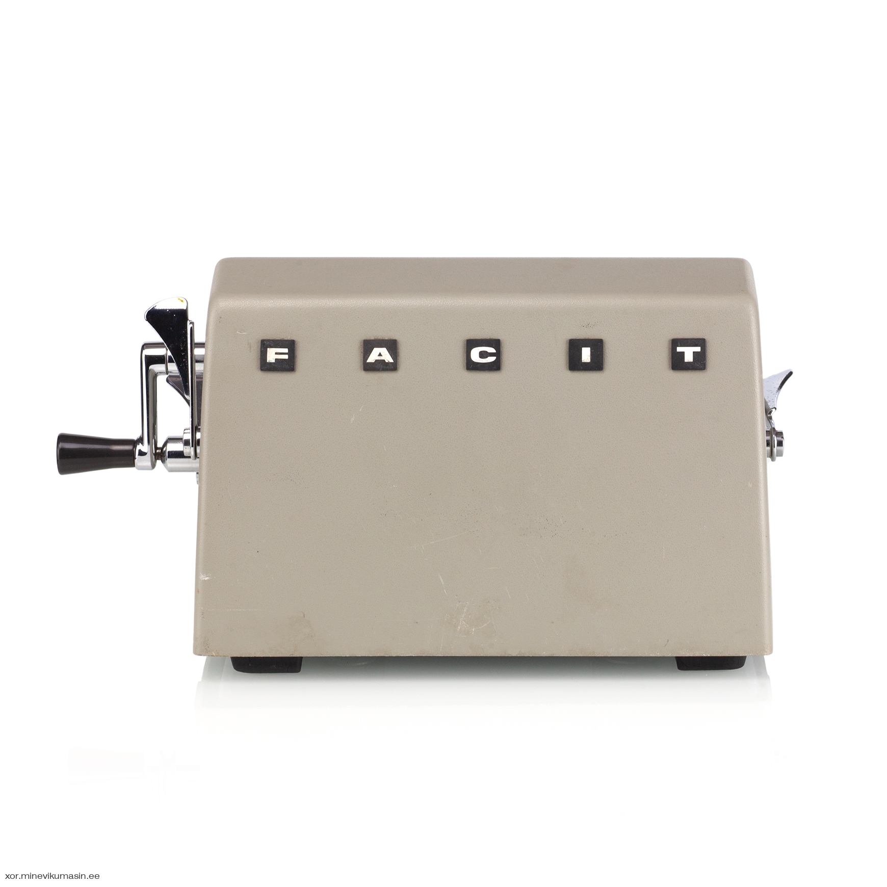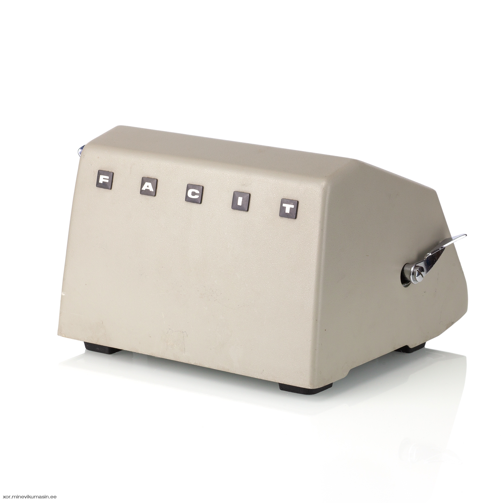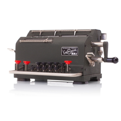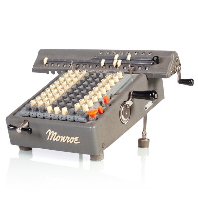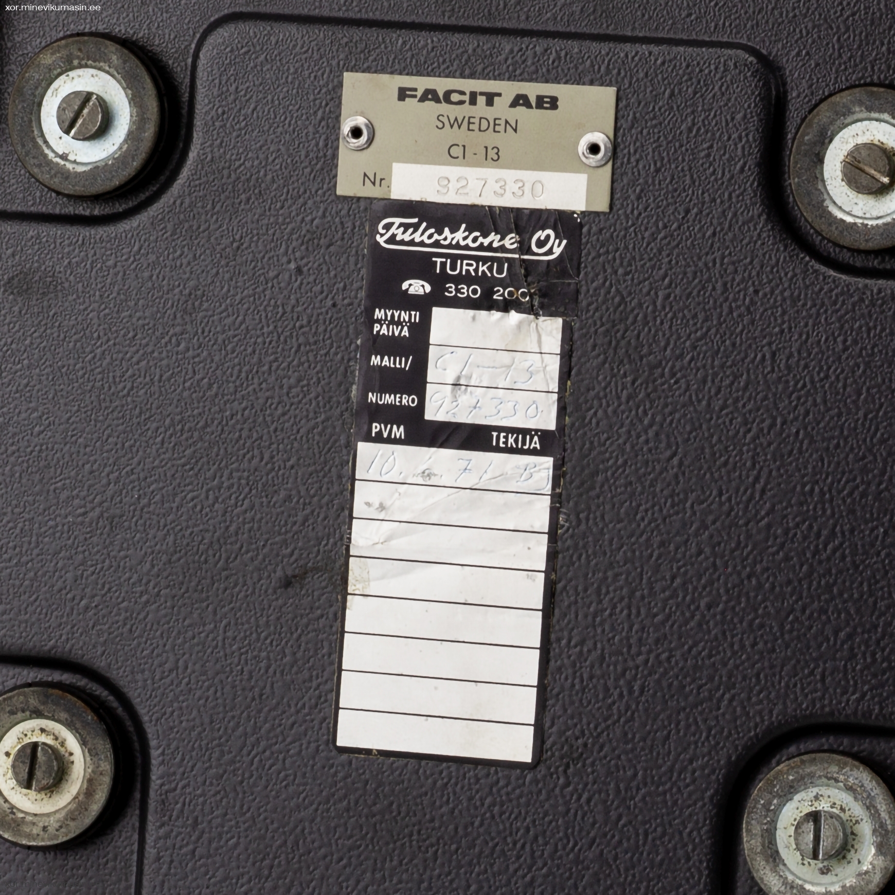 The Facit C1-13 is a mechanical calculator with a pinwheel mechanism. It was manufactured between 1957-1969 by Facit AB in Sweden and other Facit's factories across the globe. A characteristic feature of Facit machines was the input keyboard digits placement a.k.a. the Dalton keyboard. The C1-13 exterior was designed by Sigvard Bernadotte. The mechanism is based on an inverted Odhner's pinwheel-type calculator (moving setting register instead of the moving result/revolution carriage). The mechanism itself changed very little during the first Model T manufactured from 1932 onwards, followed by TK (from 1936), NTK (from 1954), and finally C1-13 (from 1956). Model C1-13 was manufactured in large numbers until 1969. This machine comes from Turku, Finland. It has a service label on the bottom from the service company Tuloskone Oy. It was last serviced on 7th of April 1971. References: ARITHMEUM Registers: 9 x 8 x 13 Weight: 6,4 kg Dimensions: 15 x 31 x 21 cm | ||||