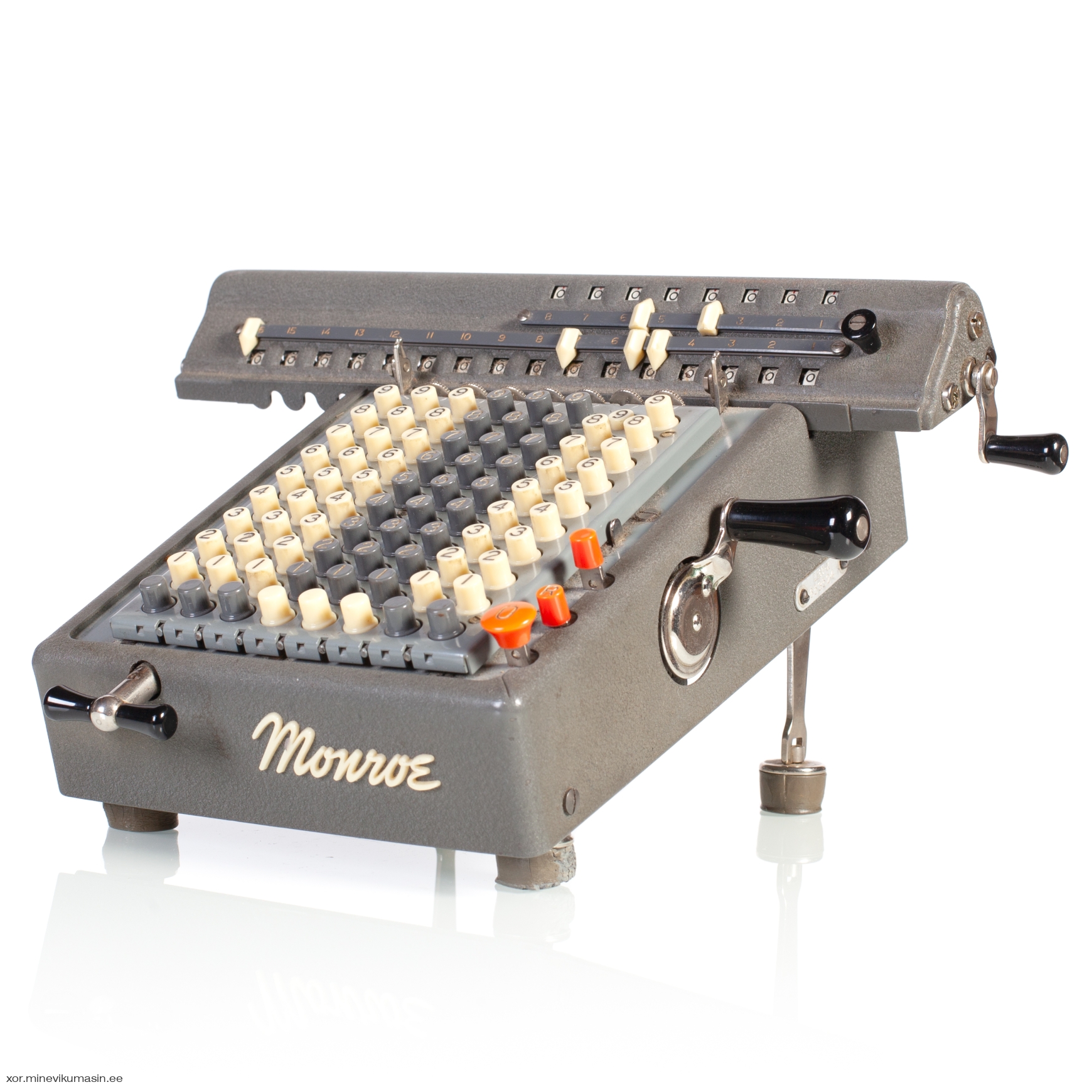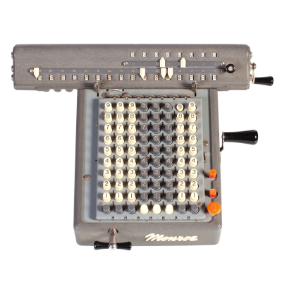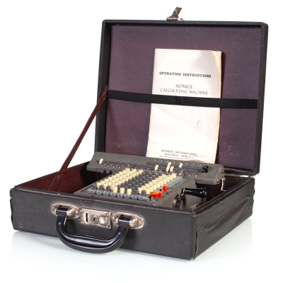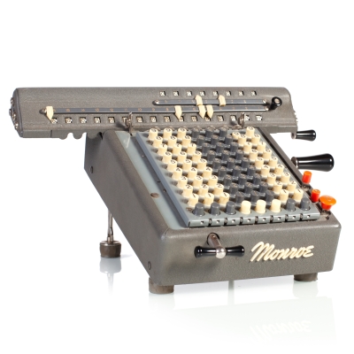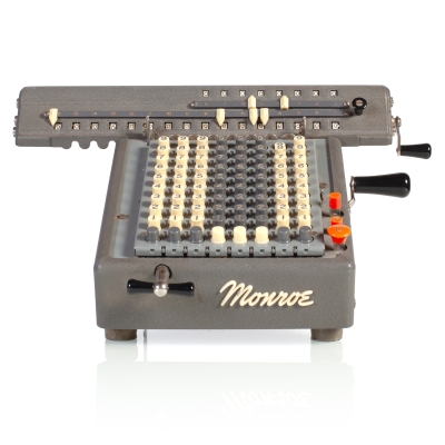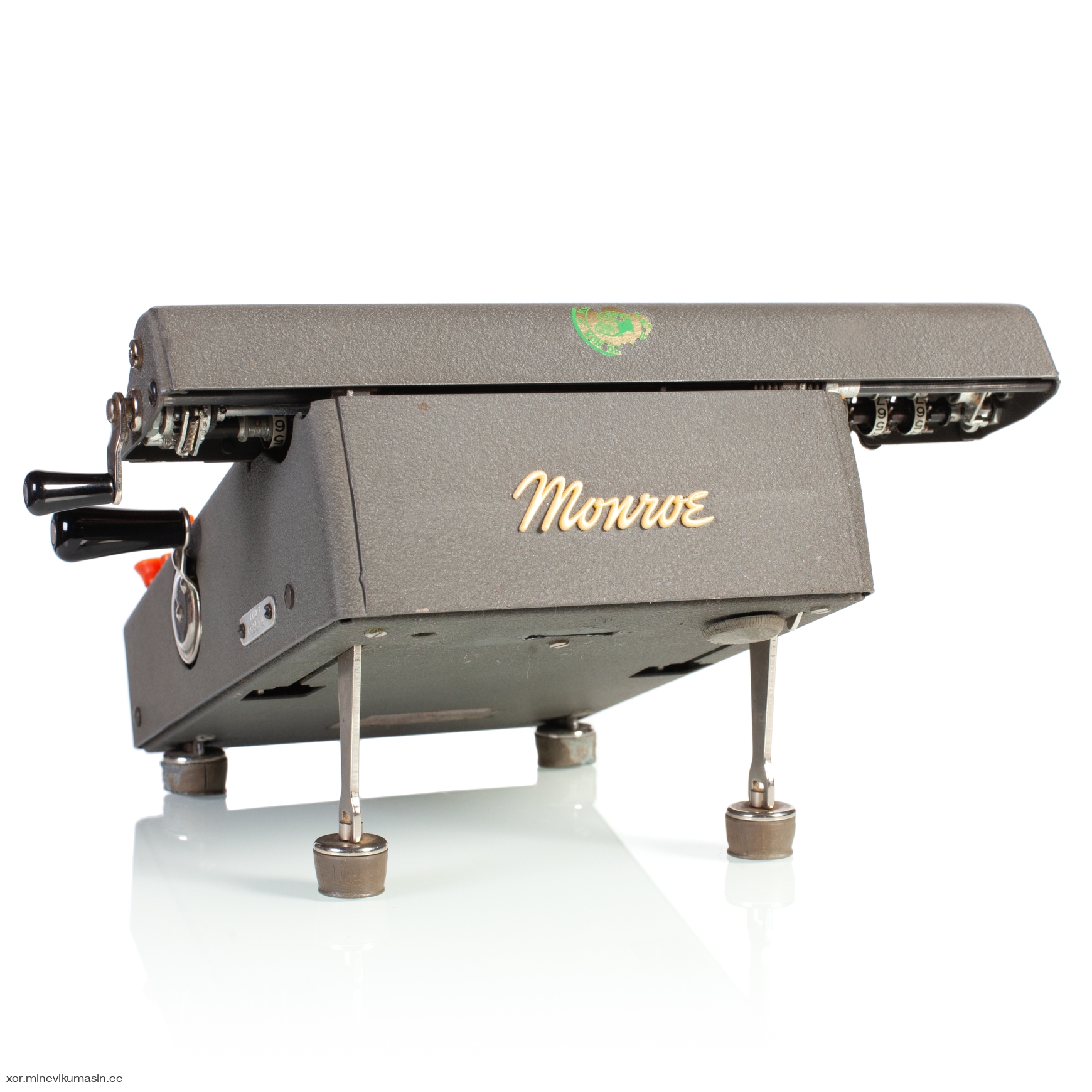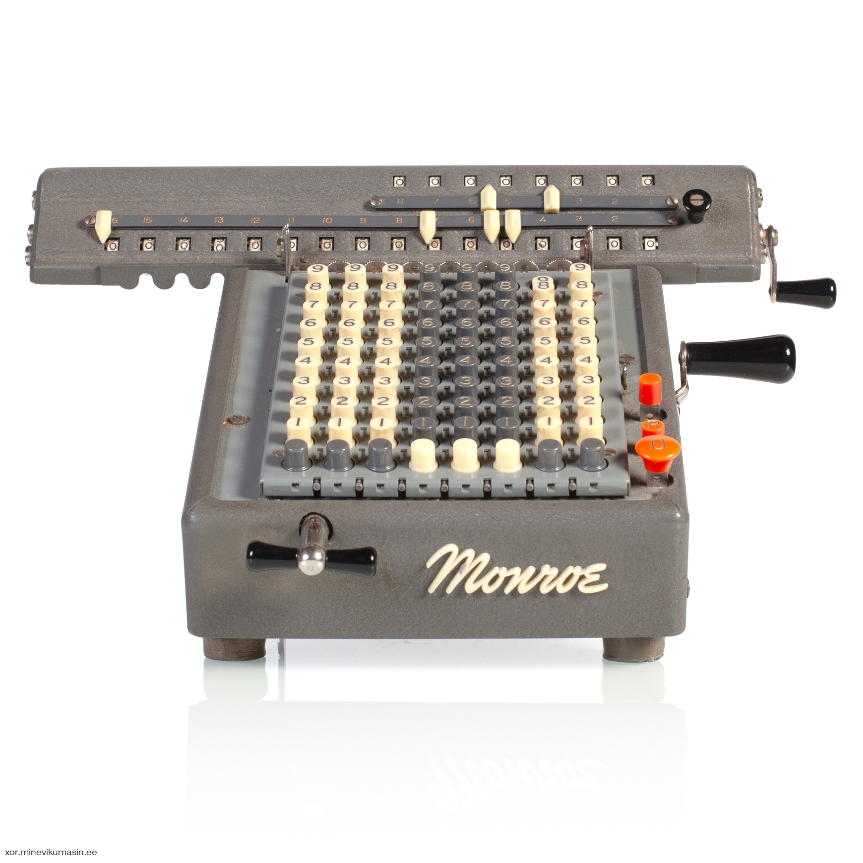 The Monroe Calculating Machine Company was formed in New York in 1912 by businessman Jay Randolph Monroe. He saw an opportunity to bring Frank Baldwin's invention, the pinwheel mechanism, to commercial use. Although Baldwin's calculating machine was patented as early as 1874, it wasn't developed for commercial use and mass production. Monroe and Baldwin formed a partnership to develop the machine for business use. In 1914 the first commercial use mechanical calculator entered full-scale production in Orange, New Jersey. In the coming years, the Monroe product range covered a large variety of models and features, from basic hand-crank machines to high-speed motor-driven machines with multiple registers and full-automatic multiplication and division operations. Under the post-war European reconstruction plan – the Marshall Plan, Monroe established new factories in Europe – in Holland and Italy. This machine, the full-keyboard, stepped drum, hand-crank-driven Monroe L-160X, was manufactured in Monroe's Amsterdam factory in 1964. The L-series machines were designed as portable, miniaturized and lightweight calculators with foldable legs and a carrying case. References: Rechnerlexikon and John Wolff's Web Museum Registers: 8 x 8 x 16 Dimensions: 29 x 15,5 x 24 cm Weight: 3,6 kg | ||||
