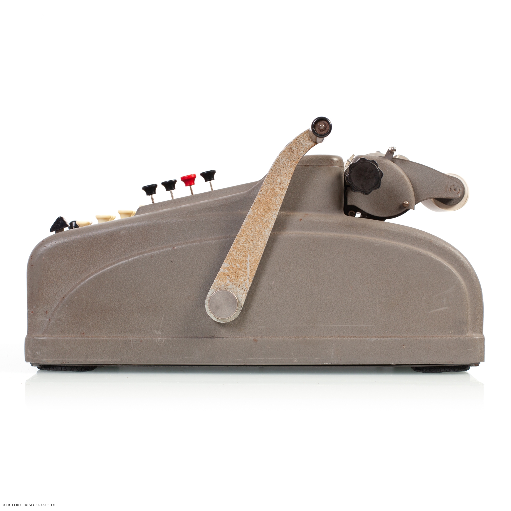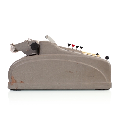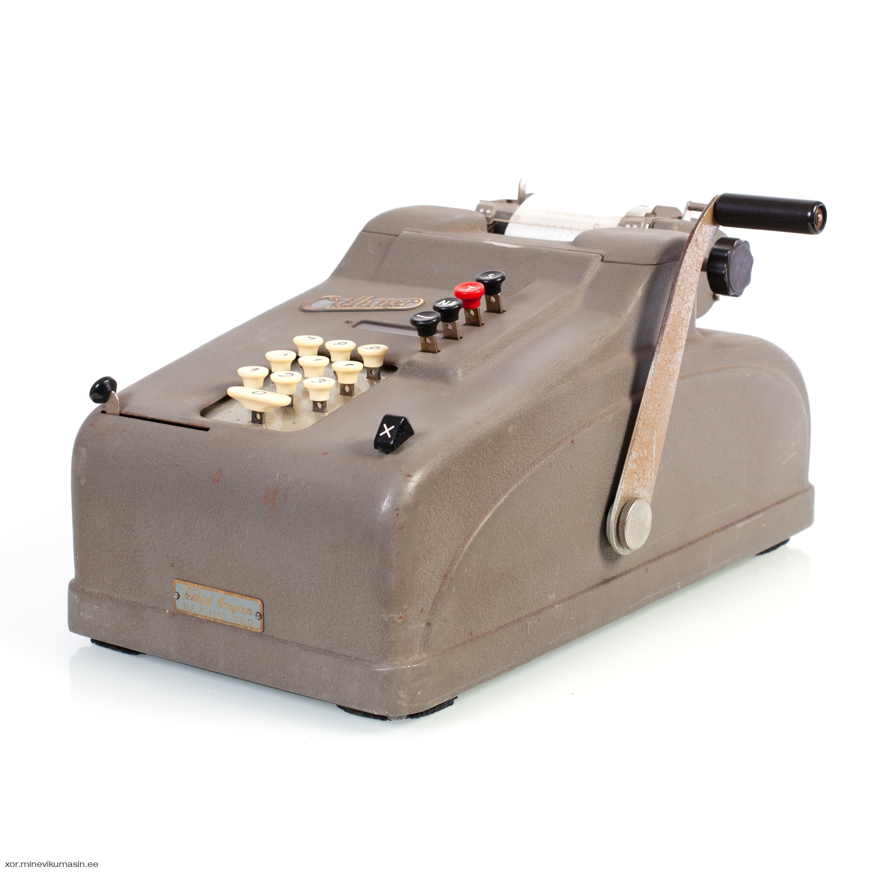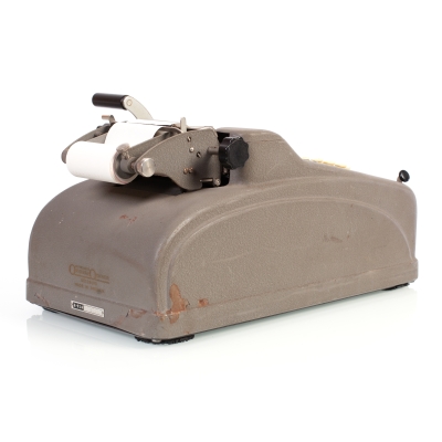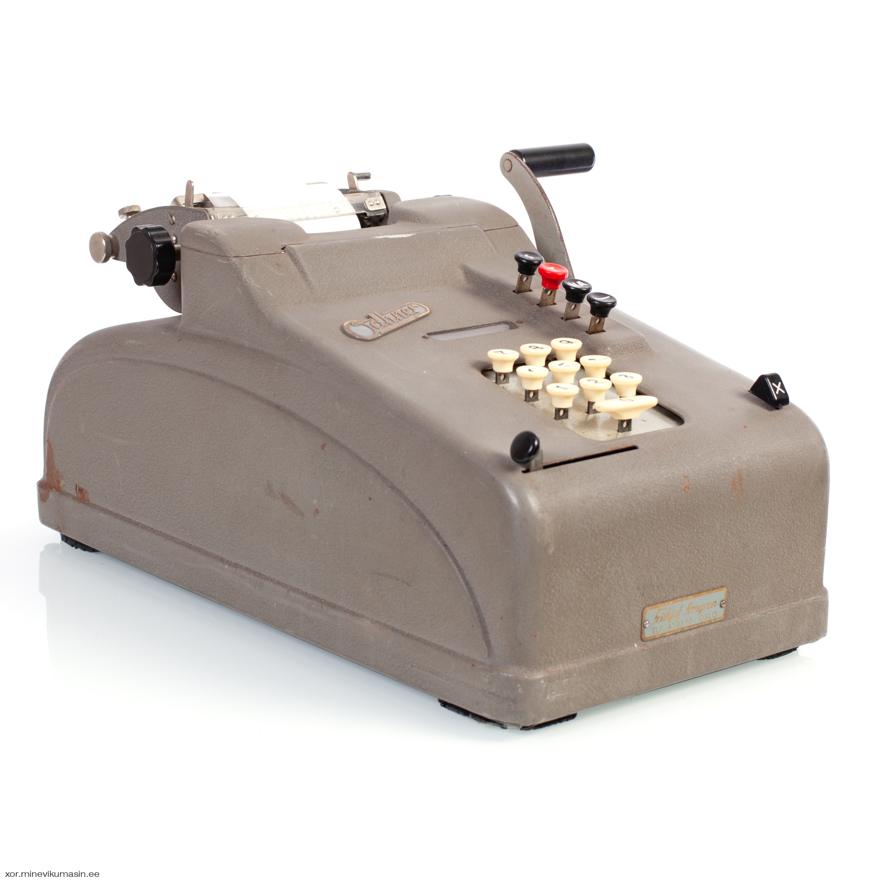 The Odhner H-9S4 is a printing, 10-key keyboard, handcrank operated mechanical calculator, manufactured by AB Original Odhner in the 1950s. It's a fourth series improved version of the hand crank operated calculator Odhner A, having 9 x 9 registers. The machine has a Norwegian dealer badge in front of the case - Frithjof Arngren, Oslo. Dimensions: 375 x 200 x 190 cm. Weight: 8,9 kg. | ||||
