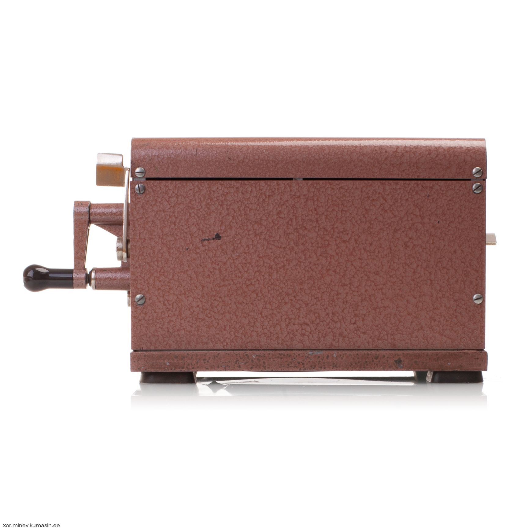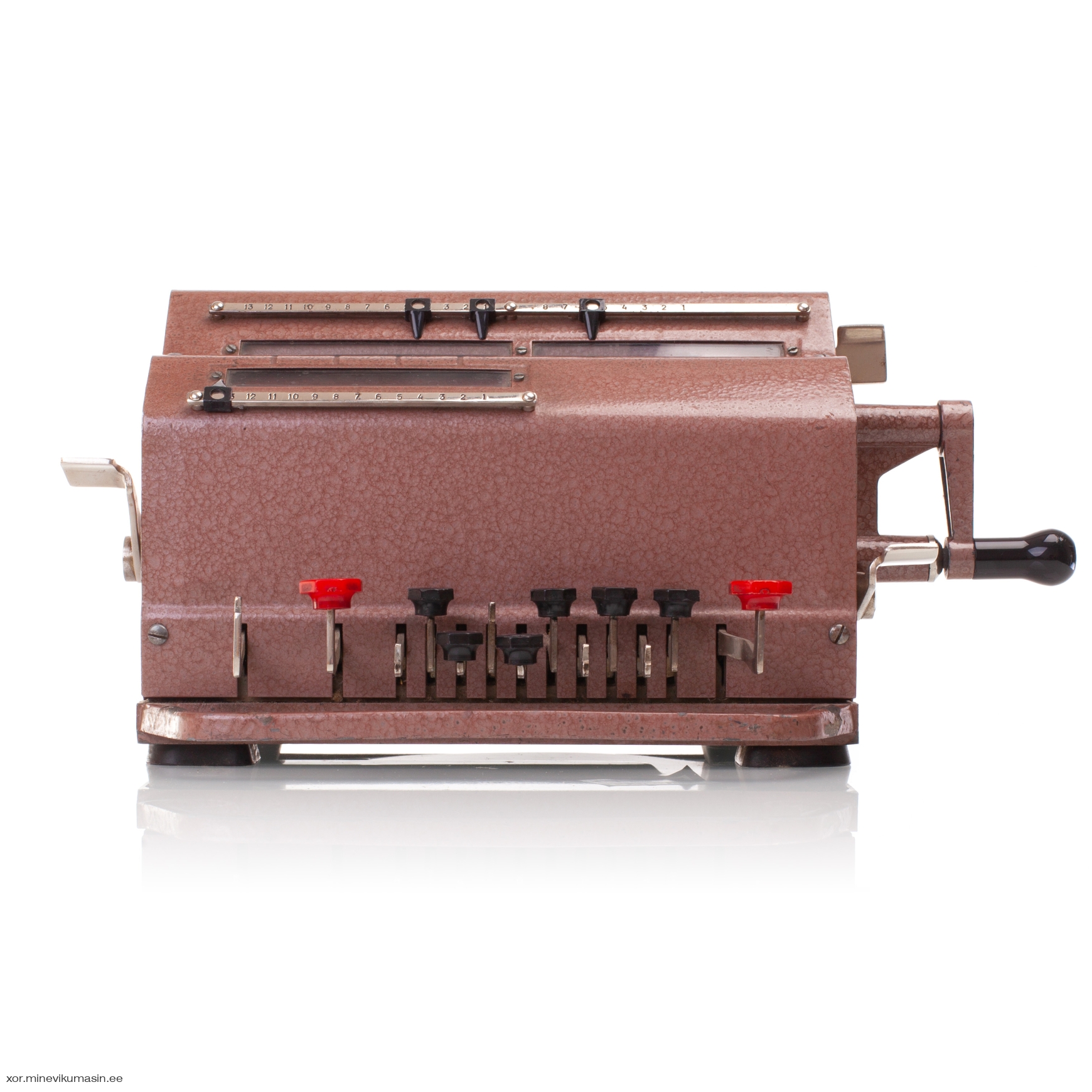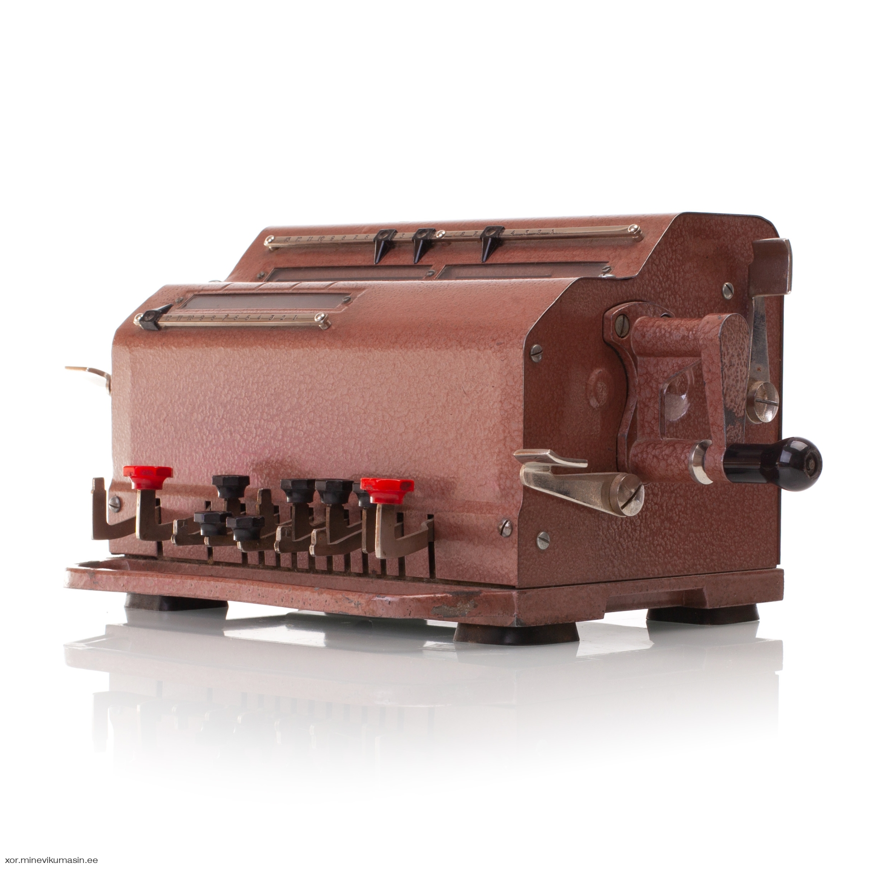 VK-1 is a 10-key (Dalton keyboard) handcrank-operated mechanical calculator. The mechanism is based on an inverted Odhner's pinwheel-type calculator (moving setting register instead of the moving result/revolution carriage). The VK-1 is a clone of Swedish Facit TK (1936-1954); the "Soviet Facit" was manufactured from 1951 to the late 1970s in Schetmash factory. Registers: 9 x 8 x 13 Weight: 5,9 kg. Dimensions: 18 x 30 x 14 cm. Manufactured according to the requirements of the USSR standard GOST 10537-65 | ||||